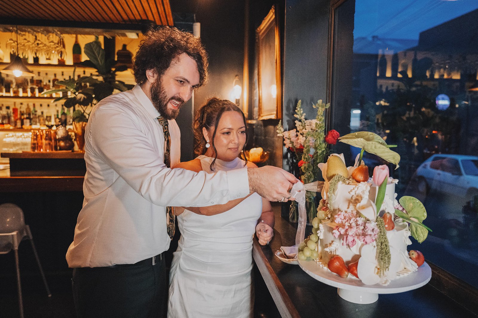 Kath from Inner North Studio not only worked her magic styling up Eden, she also enlisted her trusted co-collaborators Kevin from Soya Florals, Elly from Scene Behind, Annie of Annie Rose Artistry to come along for the ride. Rosie and Kath then found some incredible outfits from Kat the Label and Van Der Kooij for this shoot. The avant garde wedding cake and jelly desserts came from the lovely Raymond who heads cafe Raya, just up the road in Collindwood yards. We sourced some sickening earrings from Cleopatra’s Bling and rings and other bling from Studio Ingot on Brunswick Street. As night fell we played around with lights and projections against the walls of Eden and was serenaded by Jazz singer Abbey Page Williams.