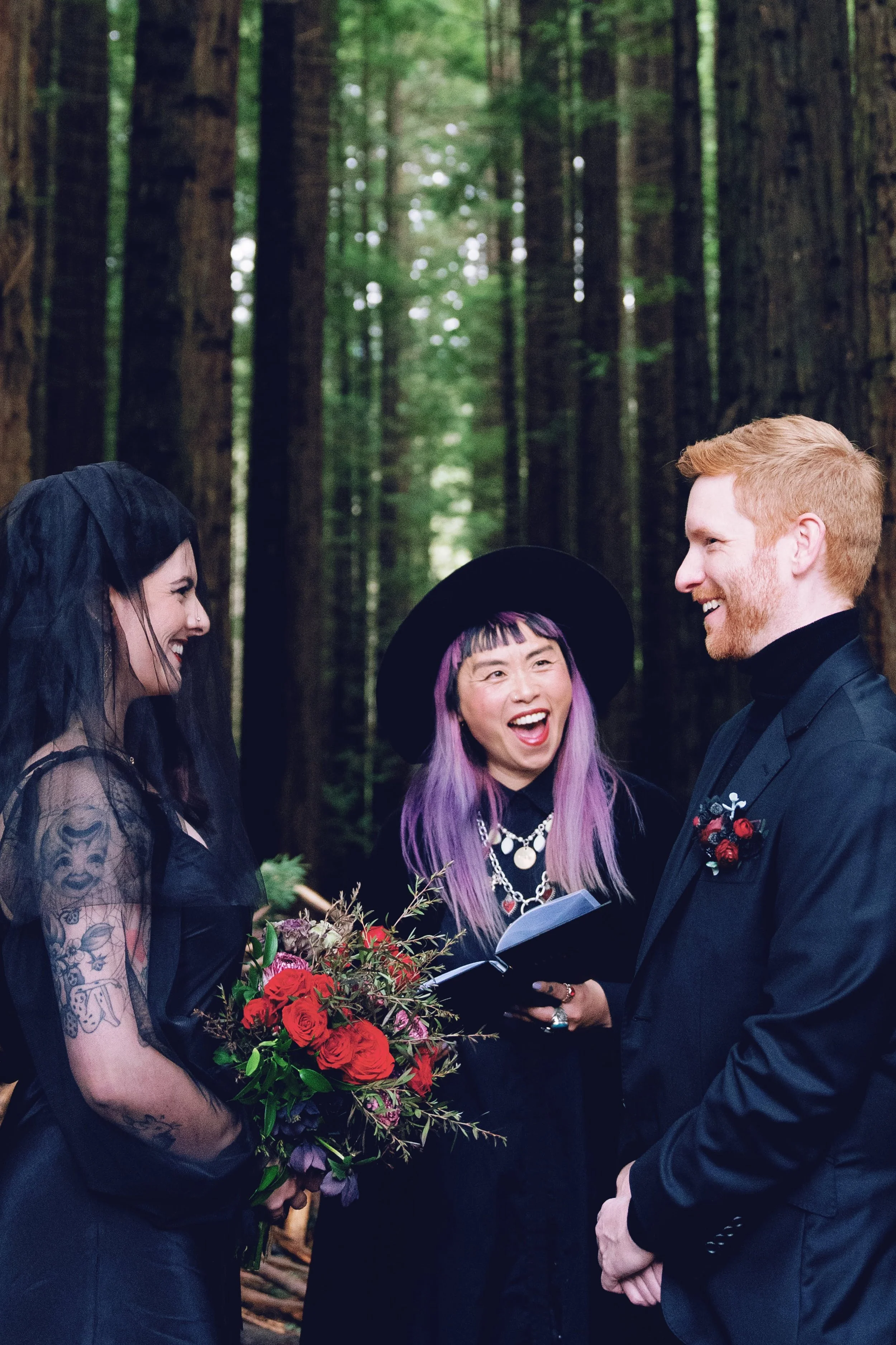 Gemma and Callan chose to have their ceremony take place at one of the impressive stick nest sculptures that were constructed by previous visitors to the forest. Getting hitched in a nest in the redwoods, it doesn’t get more freaking magical than that! The three of us stood in ceremony, looking like the holy trinity of love magic as I told their story. Their ceremony ended with a very fitting quote ‘The evening trees moan as if they knew, at night I always dream of you.’